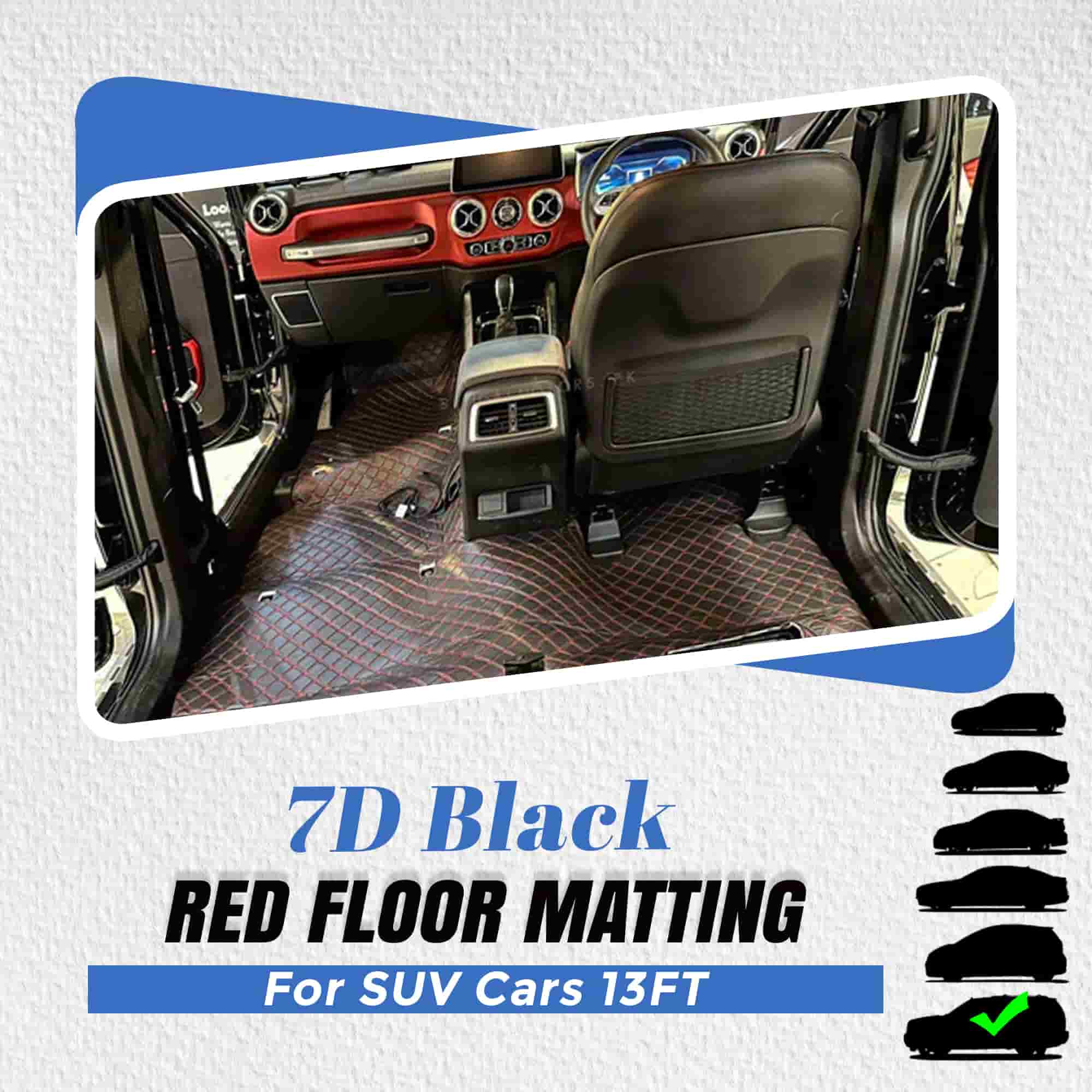 You can enhance your SUV's look with our premium 7D Black Red Floor Matting product. With its 13FT length, Sehgal Motors provides a durable and stylish matting solution that adds luxury protection to your vehicle floors.