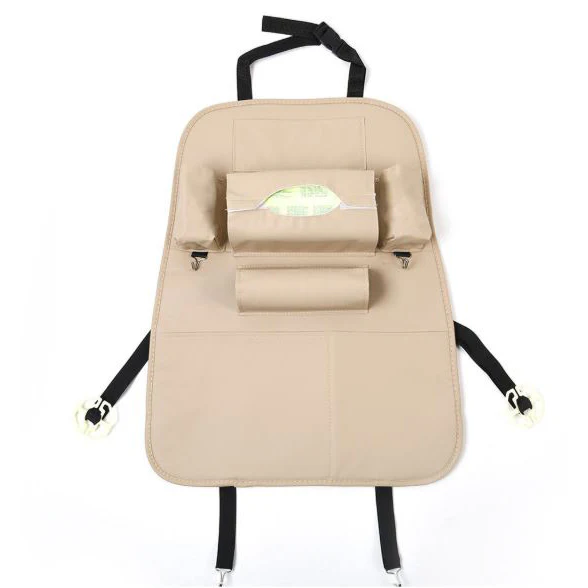 The beige Back Seat Organizer Car Caddy is a high quality accessory aimed to keep your car tidy and effective. It has several compartments in which you can keep bottles, tissues, snacks, gadgets, and others. Its grey-colored leather finish is an elegant touch to your interior car.